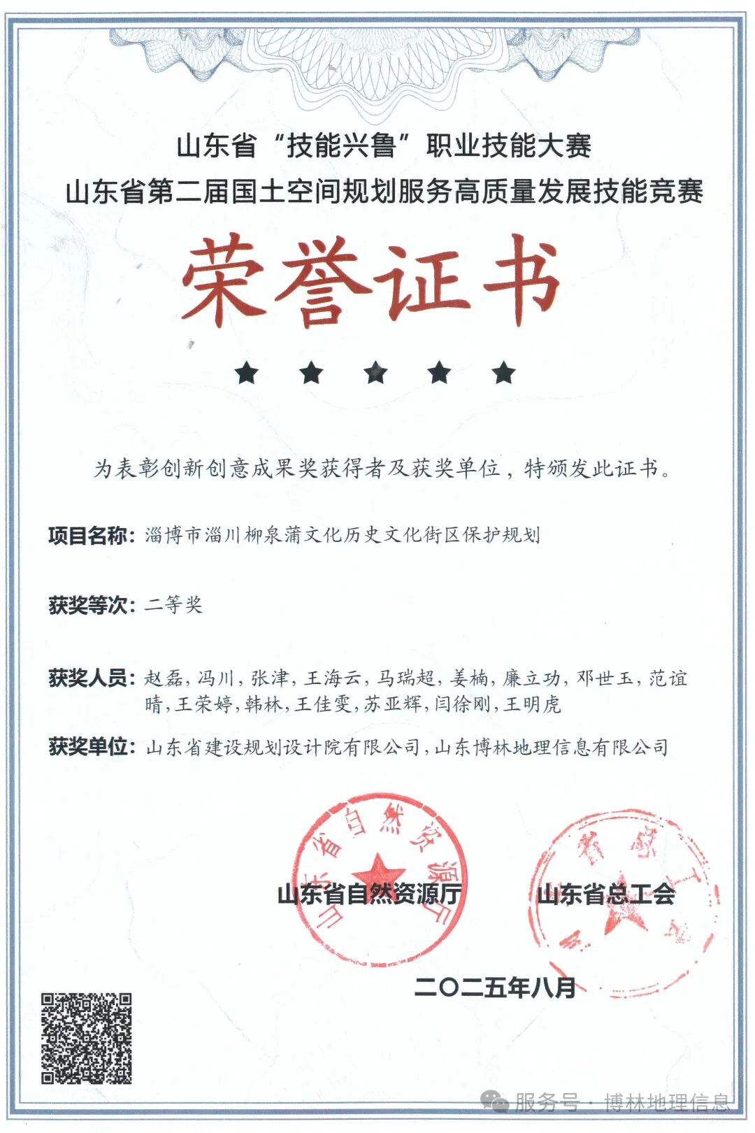 近日,山东省第二届国土空间规划服务高质量发展技能大赛圆满落幕。我公司代表队在众多参赛队伍中脱颖而出,凭借出色的专业素养、创新的规划方案和高效的团队协作,最终荣获大赛二等奖。