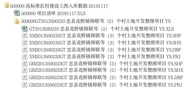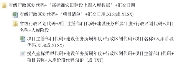(二) 汇交文件组织 县级农业农村部门应按照本《指南》规定数据格式要求,制作“十二五”以来高标准农田建设项目上图入库数据,并按照图二规定的数据包目录结构进行文件组织后,汇交到省级农业农村部门。 图二 高标准农田建设项目上图入库数据汇交目录结构 汇交上图入库数据时,应以县为单位,将汇交数据组织到统一的文件目录中,文件目录按照“省级行政区划代码+‘高标准农田建设上图入库数据’+汇交日期”方式命名。文件目录包括汇交数据的项目清单以及每个项目的数据文件目录。每个项目数据文件目录按照“省级行政区划代码+项目主管部门代码+建设任务所属年度+县级行政区划代码+项目名称+项目阶段”方式命名。其中:省级行政区划代码为汇交省份 6 位行政区划代码;项目主管部门代码为 FG、CZ、GT、SL、NY 或 QT,分别对应发展改革、财政(农发)、国土、水利、农业及其他部门;建设任务所属年度为项目批复文件明确的建设任务所属年份(备注:已完成入库但需要补充完善信息项目,按照原入库时确定的建设任务所属年度填报;“十二五”以来竣工验收但未入库项目,可根据项目批复文件进行填报,文件未明确时为项目开工或验收所在的年份,从2011年开始);行政区划代码为项目所在县的行政区划代码,跨区域情况下可以为市、或者省的行政区划代码;项目名称为项目批复文件下达的项目名称;入库阶段代码为SS或YS,对应实施或验收阶段。数据文件包括表格文件(EXCEL 格式)和拐点坐标文件(Shapefile 格式或者 TXT 格式)。汇交文件示例如图三。 图三 高标准农田建设统一上图入库数据汇交文件示例 六、相关要求 (一)工作要求 1.数据要求。做到表格填写数据详实、拐点坐标位置准确。 2.汇交要求。明确汇交数据内容与格式,按时保质完成数据汇交。 3.质量要求。对汇交数据进行完整性、数据格式正确性、标准符合性、空间拓扑、图数一致性等方面进行质量检查,保证数据的真实和准确,详见表七。 表七 “十二五”以来高标准农田建设上图入库数据质量要求