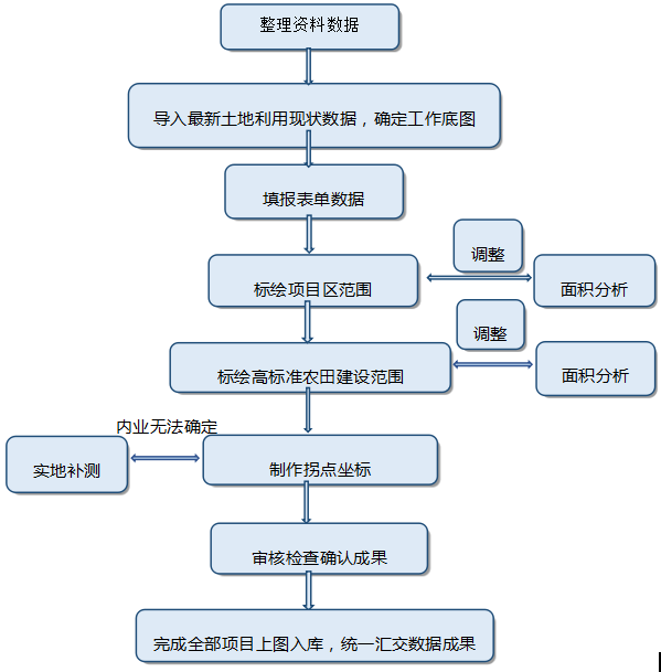 (二)统一工作底图。登录上图入库管理软件,将与县级自然资源部门共享的最新土地利用现状数据导入,作为高标准农田建设项目上图入库的“统一工作底图”。 (三)填报项目表单数据。根据高标准农田建设项目是否入库情况,按照整理汇总的项目数据,在上图入库管理软件中逐项填报项目表单信息。 (四)内业标绘项目区、高标准农田建设范围。 1.标绘项目区范围。根据具体情况,选择以下方式标绘项目区范围界线。 (1)直接标绘项目区范围。根据项目示意图、项目位置说明等,直接在上图入库管理软件上将项目区标绘在数据底图相应位置,并根据数据库中相关地类图斑范围确定项目区范围界线。 (2)纸质图纸标绘项目区范围。扫描项目纸质规划图,并进行几何纠正和矢量化,将项目区范围与最新土地利用现状数据中地类图斑层套合,完成项目区标绘。 (3)遥感影像标绘项目区范围。将配准后项目区遥感影像图矢量化,与最新土地利用现状数据中地类图斑层套合,将项目区范围落到土地利用现状图上。 (4)规划图数据导入标绘项目区范围。对于项目有规划图矢量数据的,可直接导入数据,与最新土地利用现状数据中地类图斑套合,将项目区范围落到土地利用现状图上。 2.标绘高标准农田建设范围。在前述标绘项目区范围界线的基础上,将项目区内建成高标准农田的具体地块与最新土地利用现状数据中的耕地图斑套合,标绘在土地利用现状图上。 (五)制作项目区、高标准农田建设拐点坐标 将标绘的项目区、高标准农田建设范围矢量化,确定相应的位置坐标,计算形成项目区和高标准农田建设面积。需要注意的是,已入库需要补充完善信息项目,项目区和高标准农田建设面积应与原入库数据一致,如有不同的,应在数据结构表中“备注”栏进行说明。 (六)统一汇交项目信息。县级农业农村部门在完成全部高标准农田建设项目上图入库后,应按照数据汇交要求,以数据包形式,通过光盘将上图入库信息汇交省级农业农村部门。 备注:对于未能与自然资源部门共享最新土地利用现状数据,或是内业无法确认项目区、高标准农田建设范围的,县级农业农村部门可请第三方机构实地开展拐点坐标测量,并按本指南规定的数据格式要求,将拐点坐标测量成果导入上图入库管理软件。